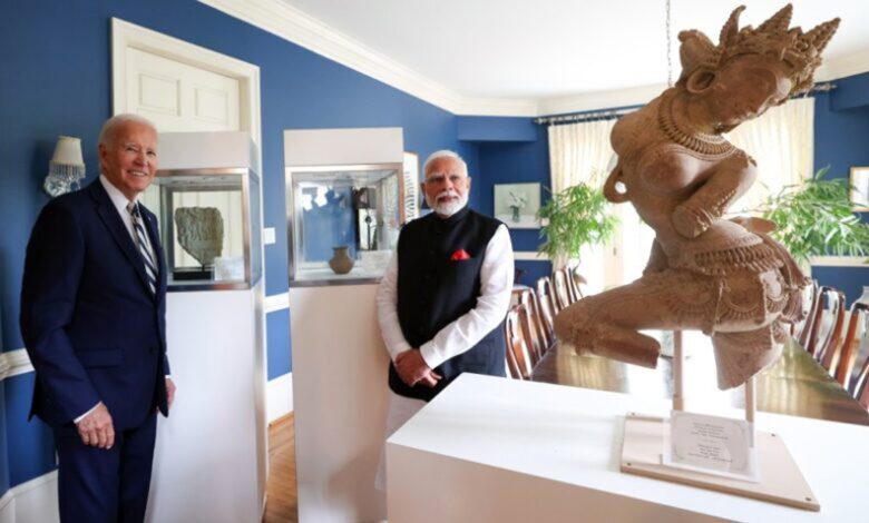 प्रधानमंत्री श्री नरेन्द्र मोदी की अमरीका की यात्रा के अवसर पर अमरीकी पक्ष ने भारत से चोरी की गयी अथवा तस्करी के माध्यम से ले जायी गयी 297 प्राचीन वस्तुओं की वापसी में सहायता की है। इन्हें शीघ्र ही भारत को वापस लौटा दिया जाएगा। डेलावेयर के विलमिंगटन में द्विपक्षीय बैठक के दौरान प्रधानमंत्री श्री नरेन्द्र मोदी और राष्ट्रपति बाइडेन को प्रतीकात्मक रूप से कुछ चुनिंदा वस्तुएं सौंपी गईं। प्रधानमंत्री ने इन कलाकृतियों की वापसी में सहयोग के लिए राष्ट्रपति बाइडेन को धन्यवाद दिया। उन्होंने कहा कि ये पुरावशेष न केवल भारत की ऐतिहासिक भौतिक संस्कृति का हिस्सा थे, बल्कि भारतीय सभ्यता एवं चेतना का आंतरिक आधार भी थे।